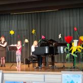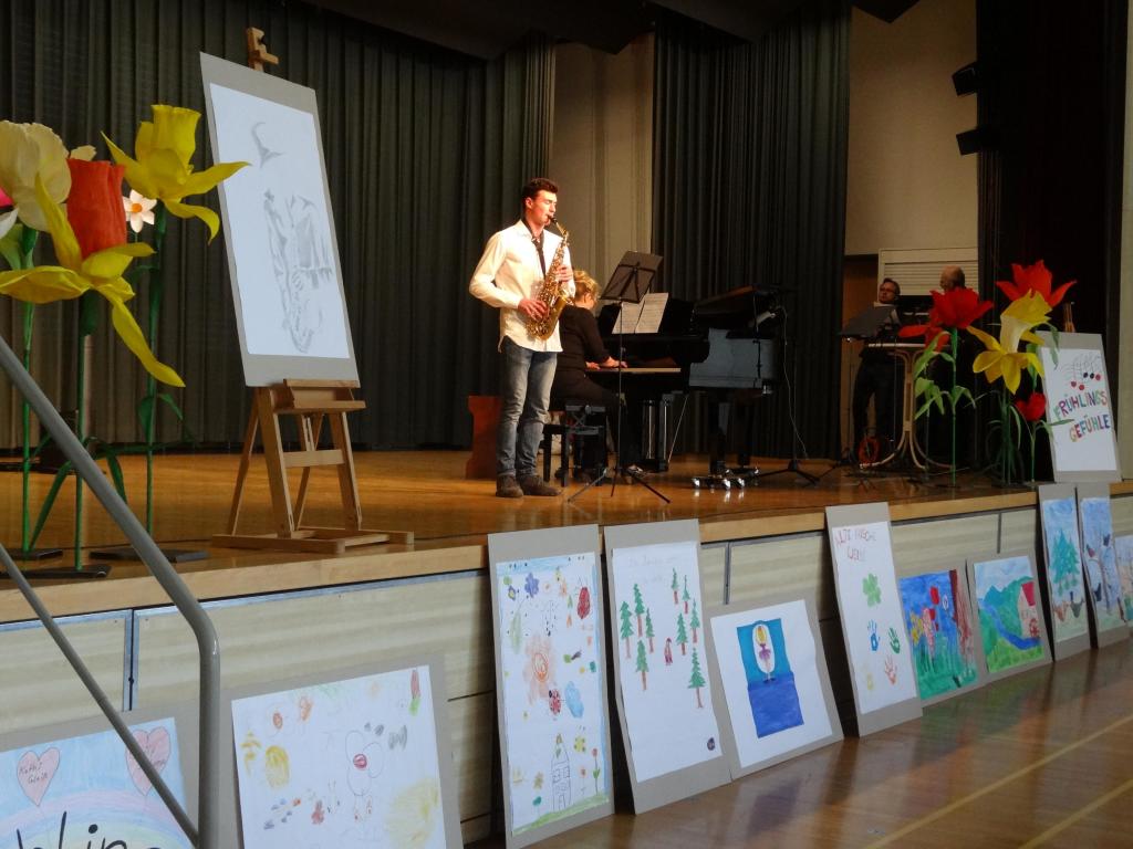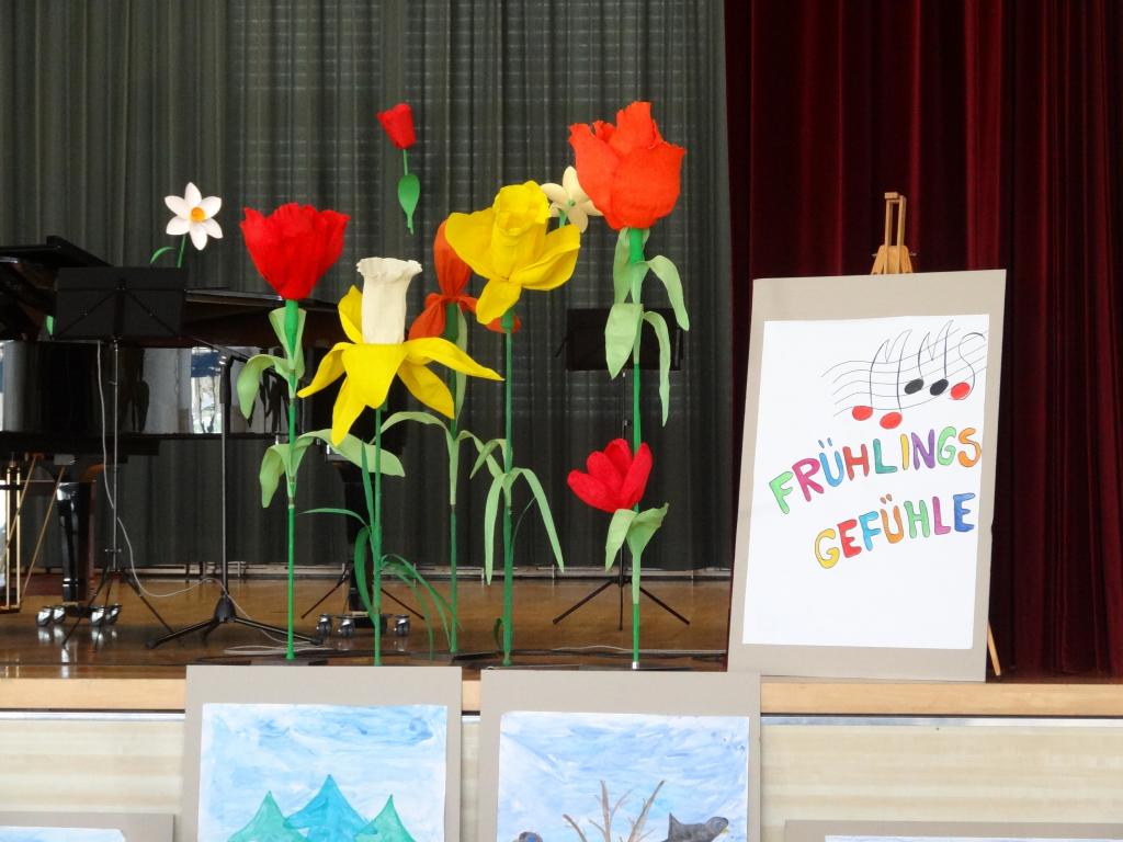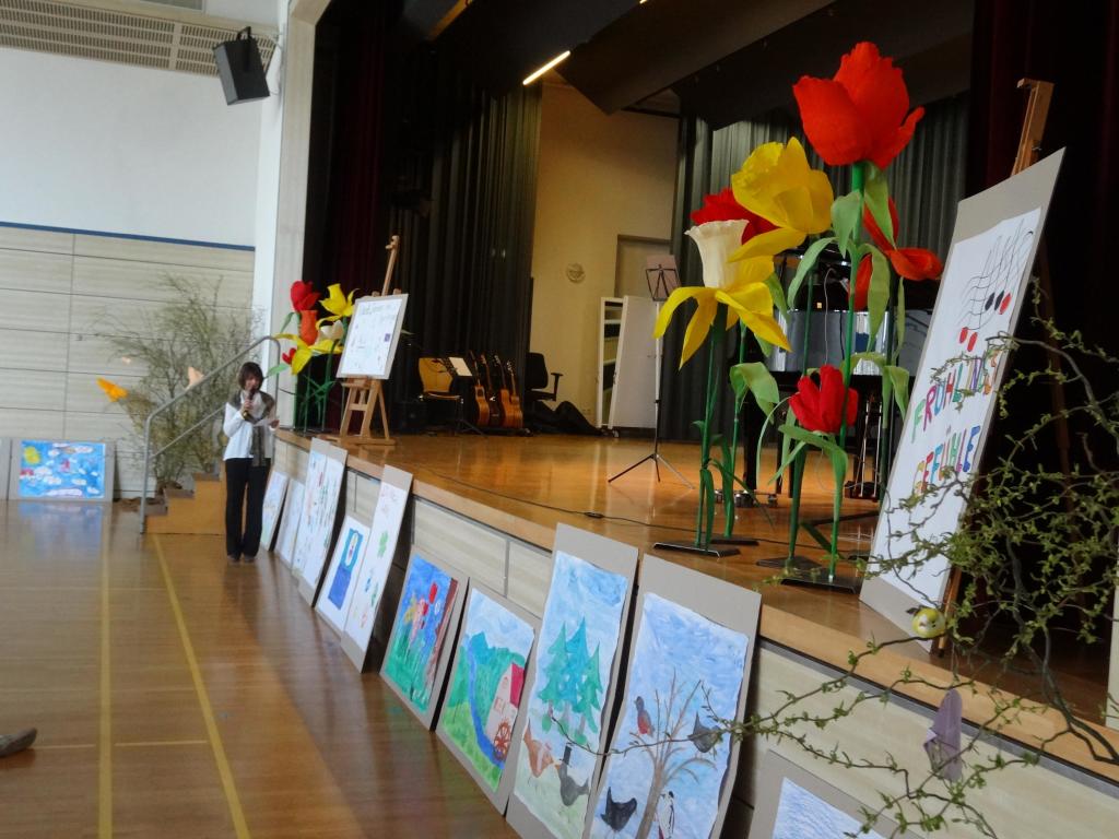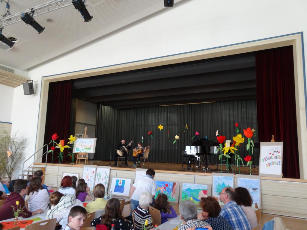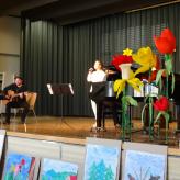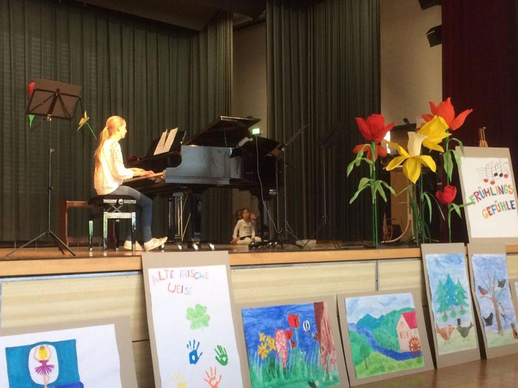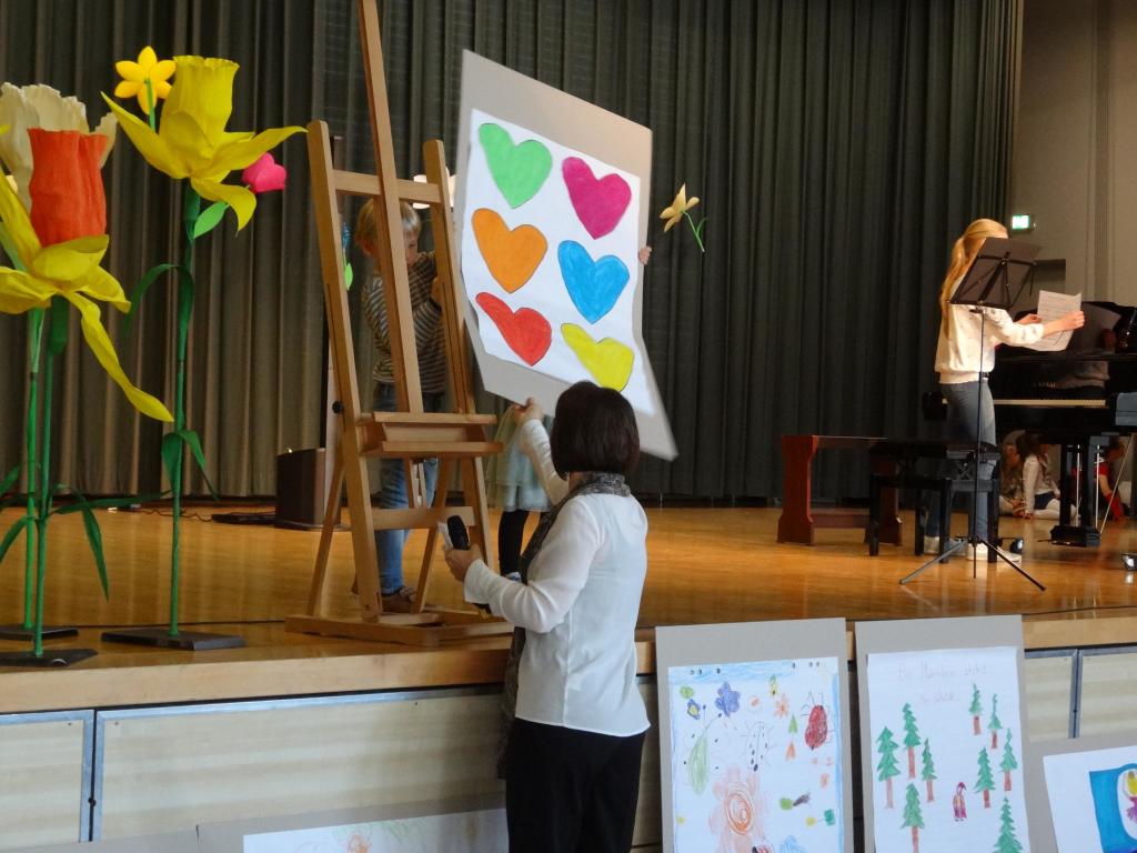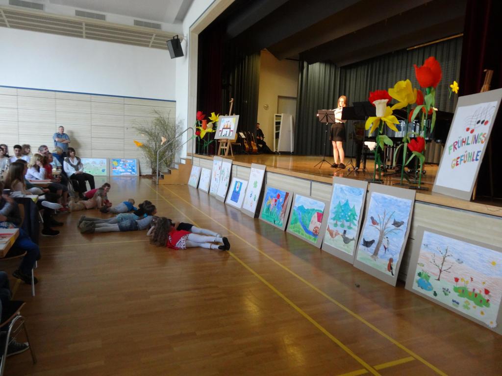 Die Kinder der Musikfantasie eröffneten das Programm mit einem Frühlingstanz. Als besondere Idee durften in diesem Jahr alle Musikschüler zu ihren dargebotenen Musikstücken Poster malen, die die Musikschüler des 1. und 2. Schuljahrs mit viel Engagement zu jedem Liedbeitrag oder Ensemble auf der Staffelei austauschten. Getreu dem Motto wurde mit Volksliedern, wie der Vogelhochzeit und fröhlichen klassischen Melodien, wie einem fröhlichen Marsch oder einem Scherzino die "Frühlingsgefühle" geweckt. Nicht zuletzt rundeten bekannte oder auch weniger bekannte Frühlingsgedichte das abwechslungsreiche Musikprogramm ab. Gelungen waren vor allem die teils bunt gemischten Ensembles, die es verstanden, das Publikum mit ihren musikalischen Darbietungen zu begeistern. Oft auch auf der Bühne unterstützt von den engagierten Musiklehrern des Musikschulvereins.