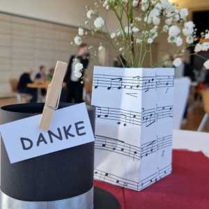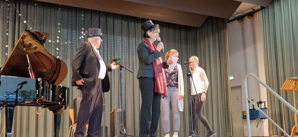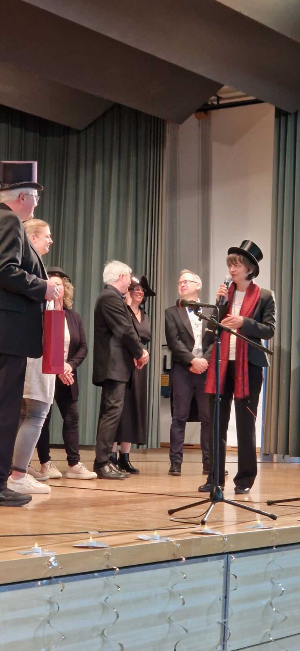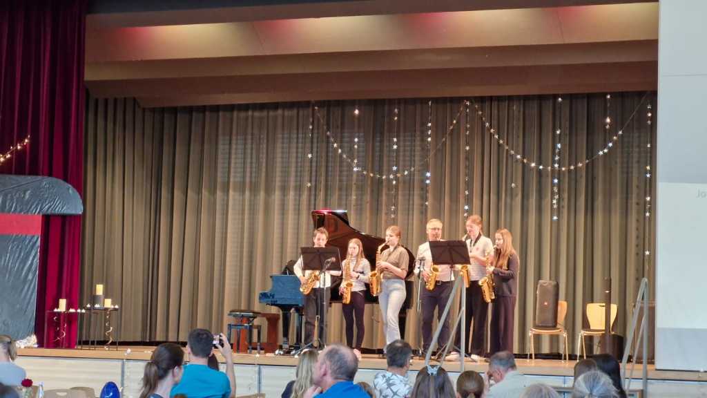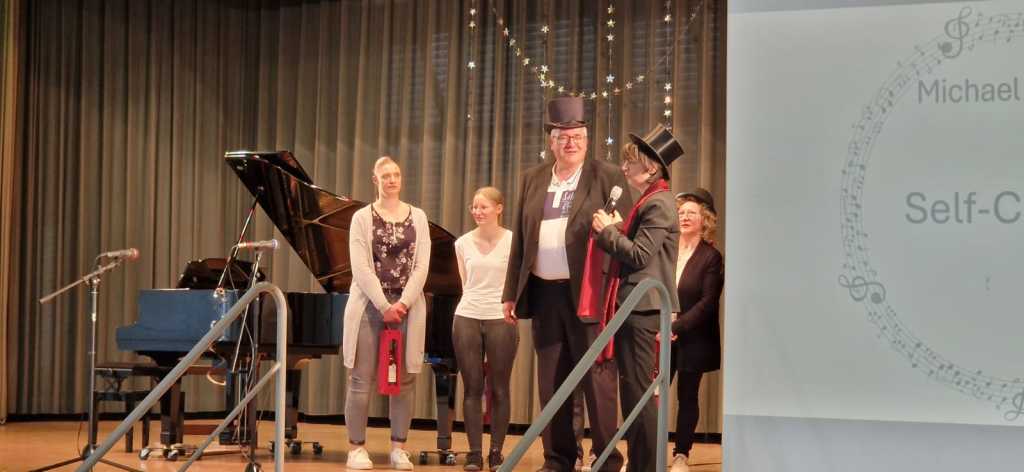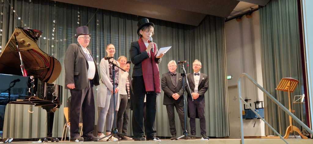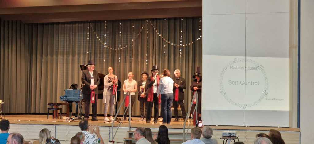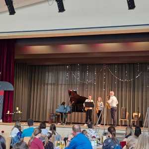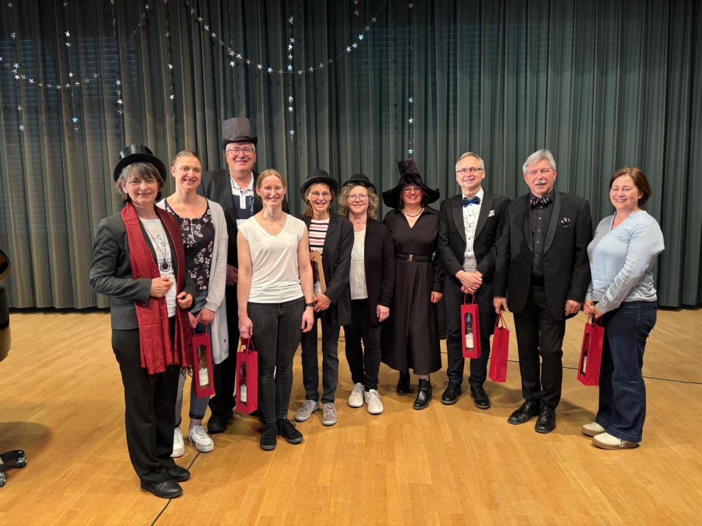 Zum Ende der Veranstaltung wurde es noch einmal feierlich auf der Bühne. Der Vorstand nutzte den Rahmen, um sich bei allen zu bedanken, die hinter den Kulissen die Fäden ziehen. Mit einer Geste der Anerkennung wurde das Engagement der Vorstandsmitglieder gedankt: allen Musiklehrer*innen und der Kassiererin Linda Weber, Schriftführerin Birgit Heck (die zudem für ihr 10-jähriges Jubiläum gewürdigt wurde), den Beisitzerinnen Ute Weber und Sandra Paule. Der 2. Vorsitzende Herbert Gottert und die 1. Vorsitzende Manuela Flurer-Wiedmann dankten sich gegenseitig für die erfolgreiche Zusammenarbeit und den unermüdlichen Einsatz für den Verein. Außerdem bedankte sich der Vorstand bei Jasmin Rogner, die dieses Jahr als Beisitzerinnen ausgeschieden ist.