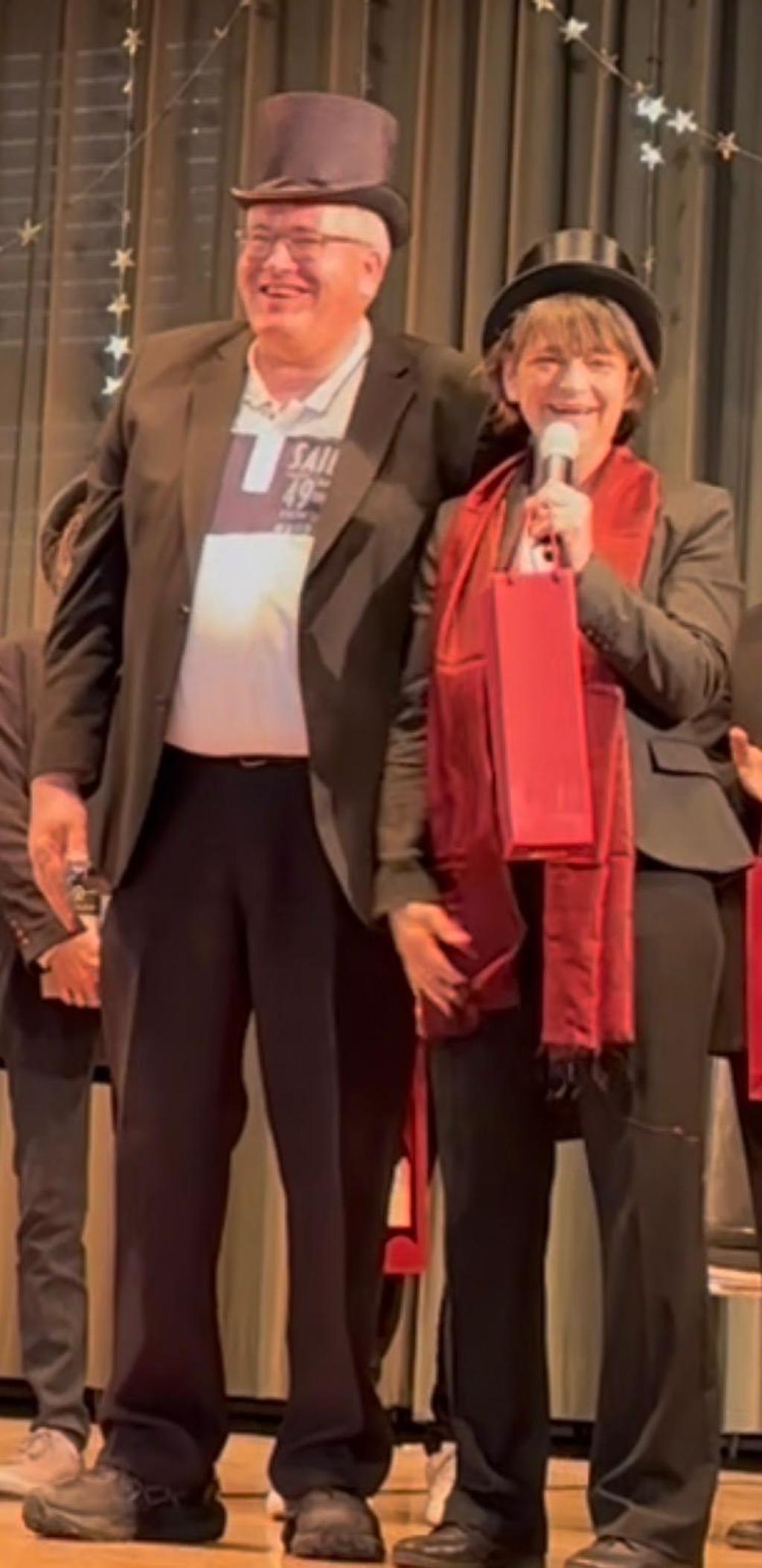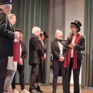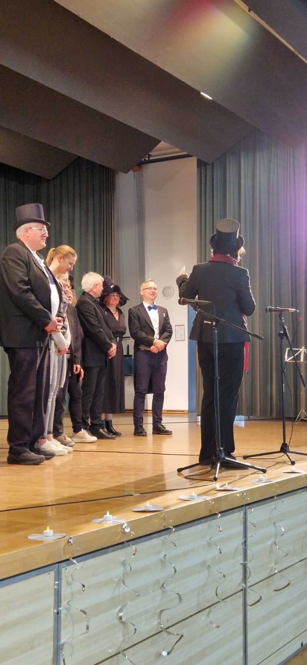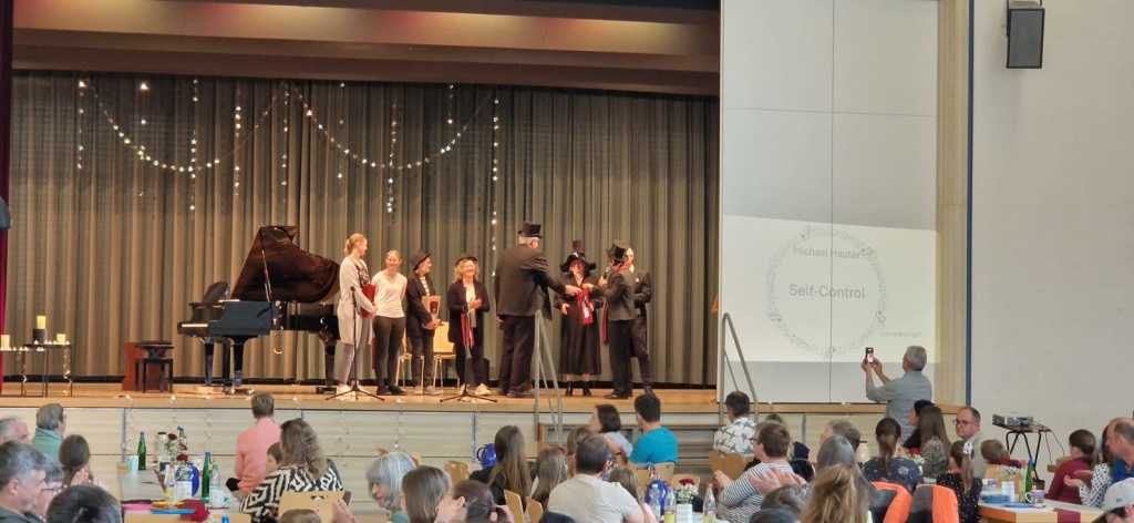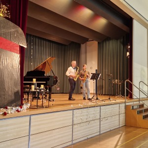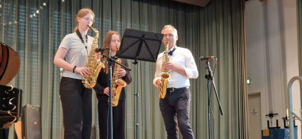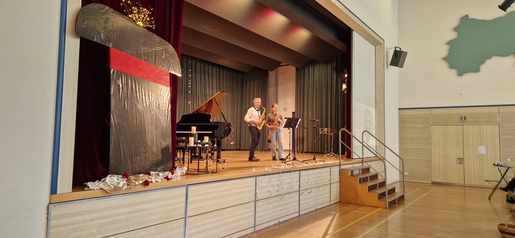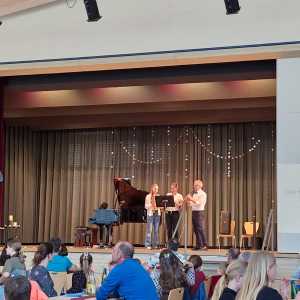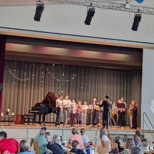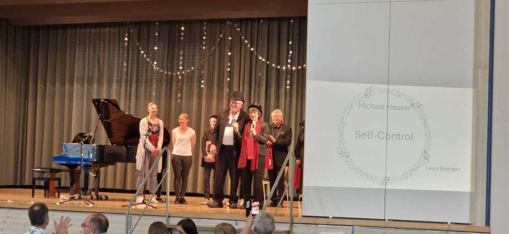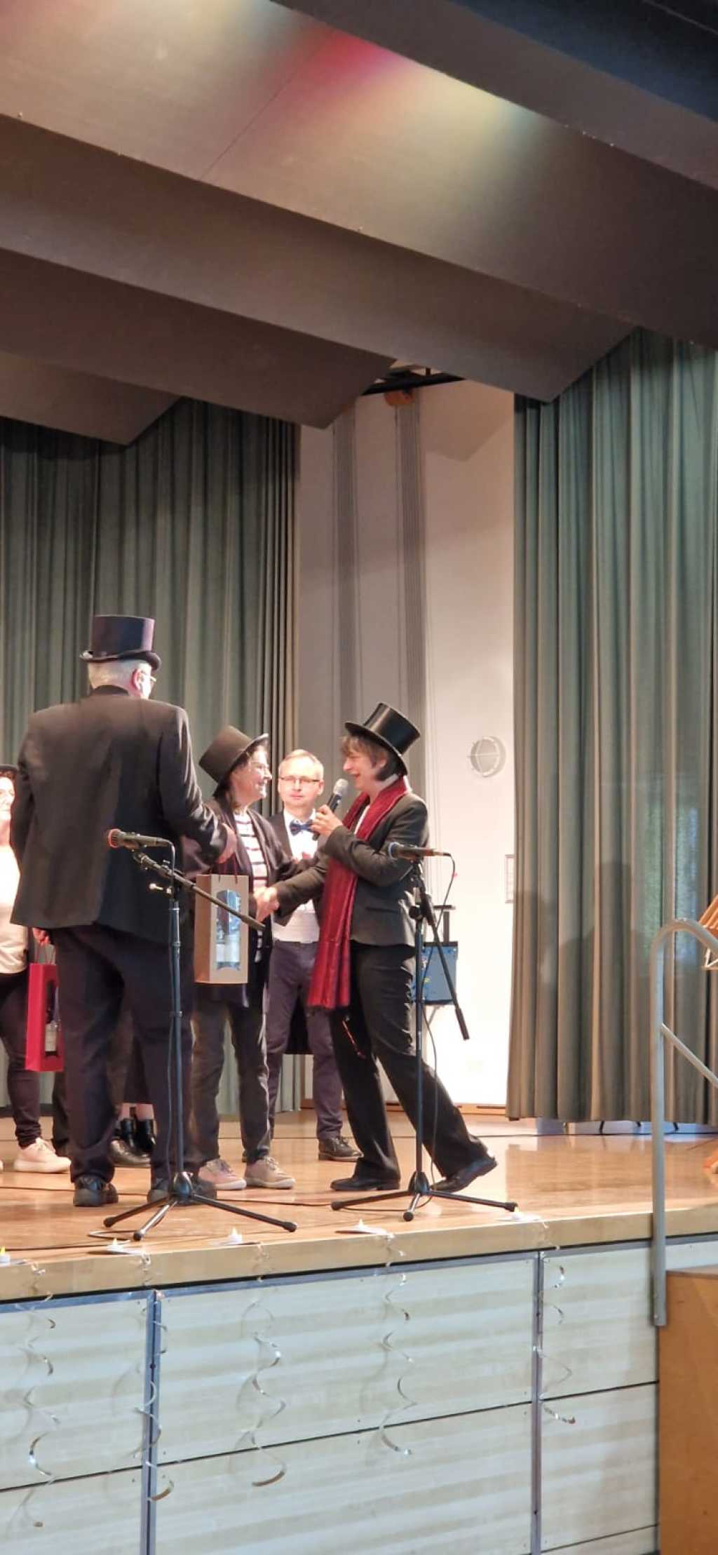Zum Ende der Veranstaltung wurde es noch einmal feierlich auf der Bühne. Der Vorstand nutzte den Rahmen, um sich bei allen zu bedanken, die hinter den Kulissen die Fäden ziehen. Mit einer Geste der Anerkennung wurde das Engagement der Vorstandsmitglieder gedankt: allen Musiklehrer*innen und der Kassiererin Linda Weber, Schriftführerin Birgit Heck (die zudem für ihr 10-jähriges Jubiläum gewürdigt wurde), den Beisitzerinnen Ute Weber und Sandra Paule. Der 2. Vorsitzende Herbert Gottert und die 1. Vorsitzende Manuela Flurer-Wiedmann dankten sich gegenseitig für die erfolgreiche Zusammenarbeit und den unermüdlichen Einsatz für den Verein. Außerdem bedankte sich der Vorstand bei Jasmin Rogner, die dieses Jahr als Beisitzerinnen ausgeschieden ist.