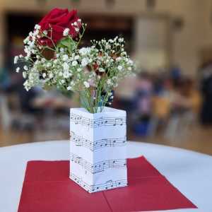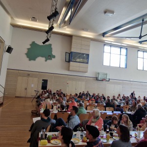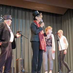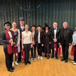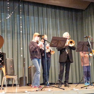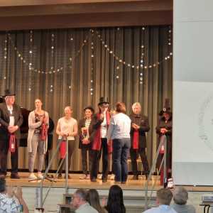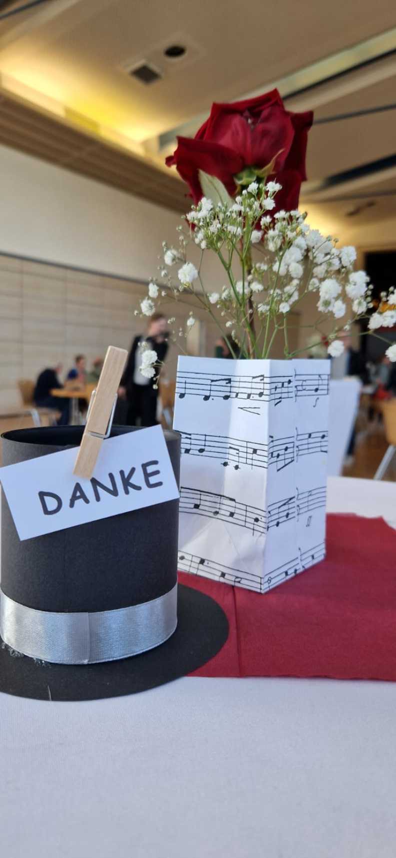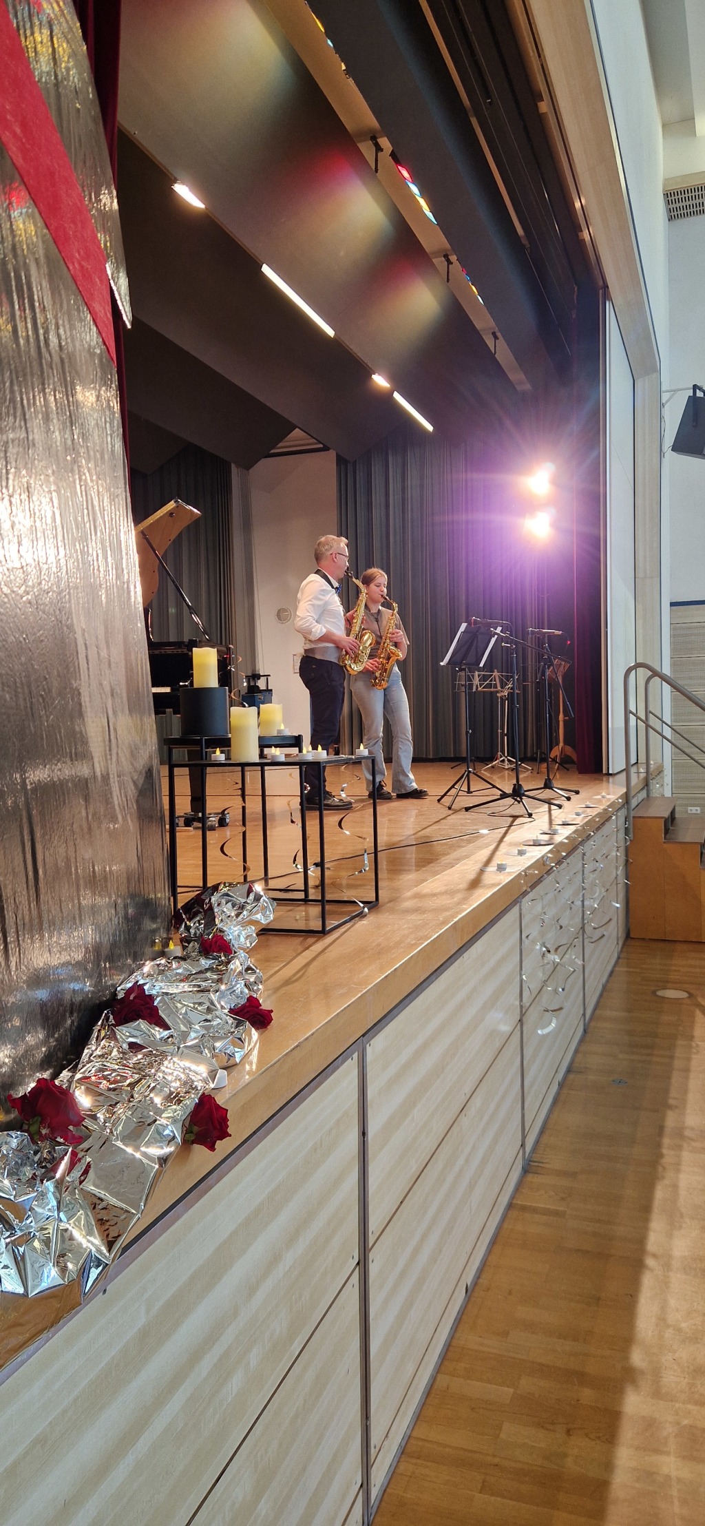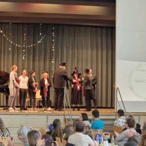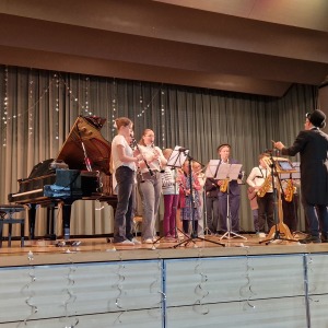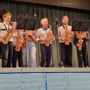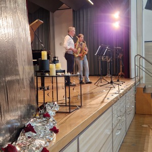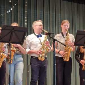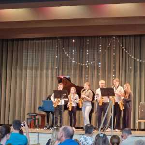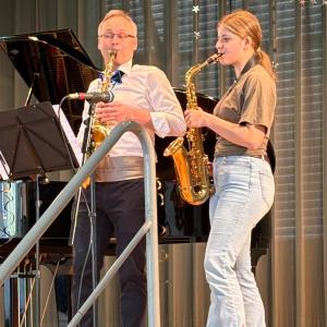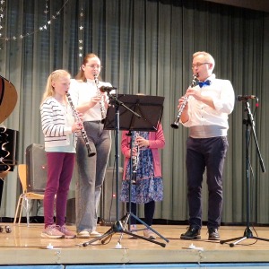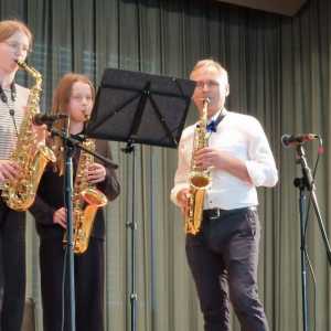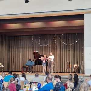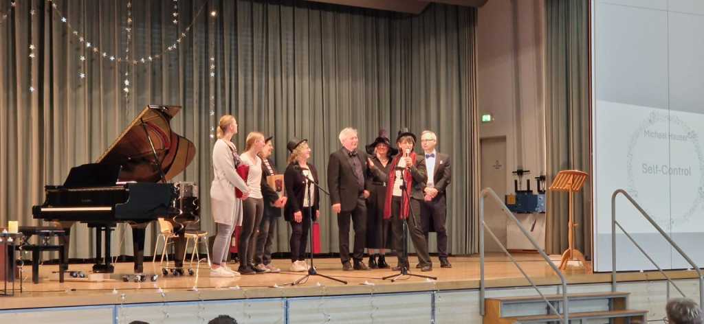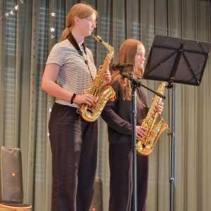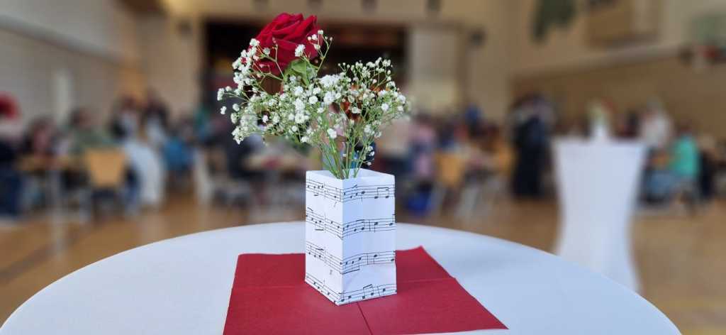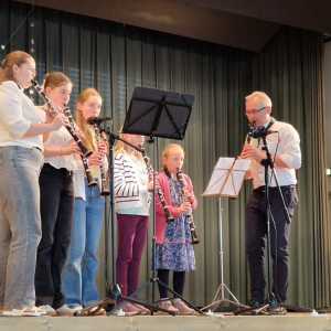Zum Ende der Veranstaltung wurde es noch einmal feierlich auf der Bühne. Der Vorstand nutzte den Rahmen, um sich bei allen zu bedanken, die hinter den Kulissen die Fäden ziehen. Mit einer Geste der Anerkennung wurde das Engagement der Vorstandsmitglieder gedankt: allen Musiklehrer*innen und der Kassiererin Linda Weber, Schriftführerin Birgit Heck (die zudem für ihr 10-jähriges Jubiläum gewürdigt wurde), den Beisitzerinnen Ute Weber und Sandra Paule. Der 2. Vorsitzende Herbert Gottert und die 1. Vorsitzende Manuela Flurer-Wiedmann dankten sich gegenseitig für die erfolgreiche Zusammenarbeit und den unermüdlichen Einsatz für den Verein. Außerdem bedankte sich der Vorstand bei Jasmin Rogner, die dieses Jahr als Beisitzerinnen ausgeschieden ist.
