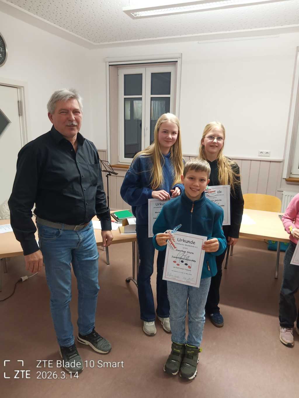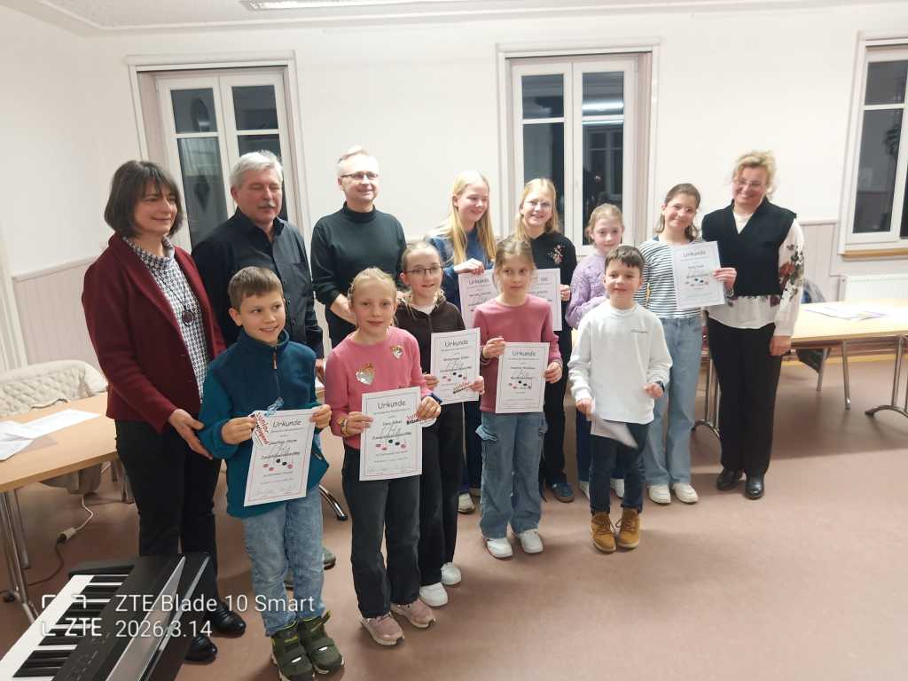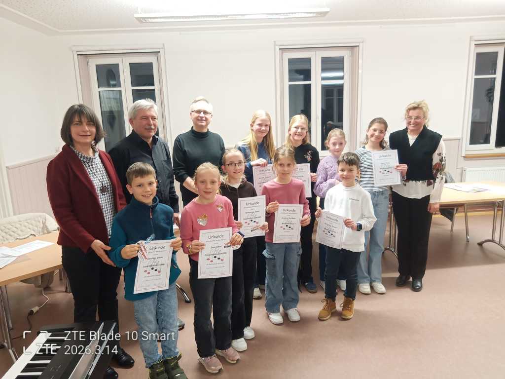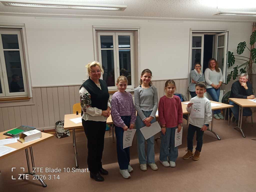Ein besonderer Programmpunkt waren die Prüfungen zum Musikabzeichen. Die Musikschüler traten in verschiedenen Gradstufen an und zeigten an ihren Instrumenten, was sie gelernt haben. Die vorgetragenen Stücke waren Teil der offiziellen Prüfung, die die Schüler direkt vor den Ohren der Versammlung erfolgreich ablegten. Der Applaus der Anwesenden war ihnen nach der Aufregung sicher.